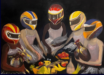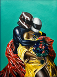Tuan Jones presents When Shadows Plié: The Choreography in Stillness, a series of paintings depicting humanoid figures performing ballet in Formula 1 helmets. The helmets allow the dancers to conceal themselves but also amplify their presence to better navigate the world of ballet, an institution that has historically excluded black and brown bodies. While Racecar driving and Ballet seemingly juxtapose– recklessness vs. grace, they relate in their culture of rigorous expectations of work and their precise and calculated movements. Dancers prance through a forest floor, bestrewn in contradiction, Jones creates a contemplative world where the viewer questions how they occupy and are perceived in space.